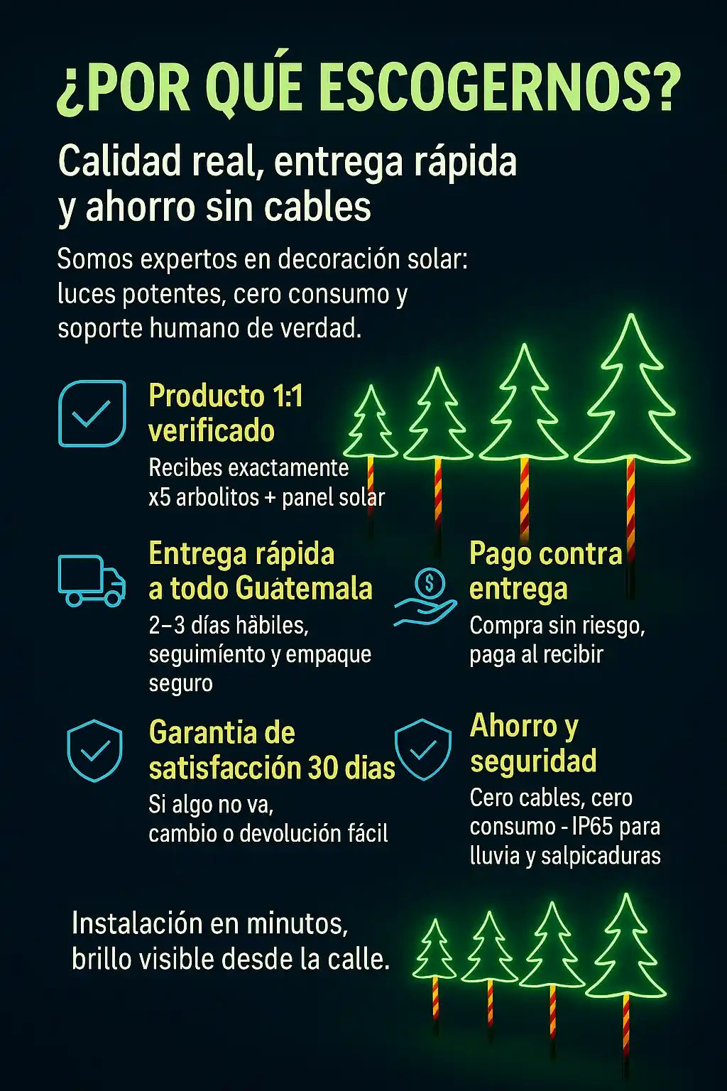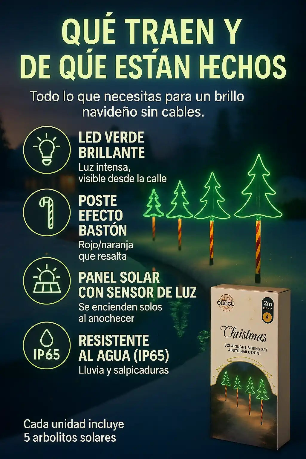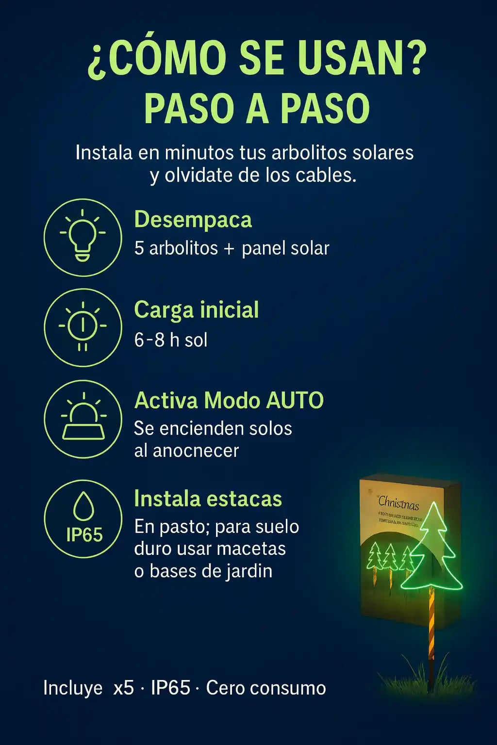 Cada unidad trae 5 arbolitos solares con sus estacas + panel solar y control ON/AUTO.