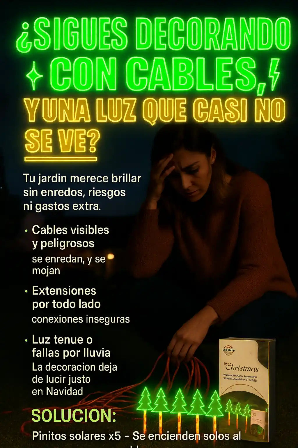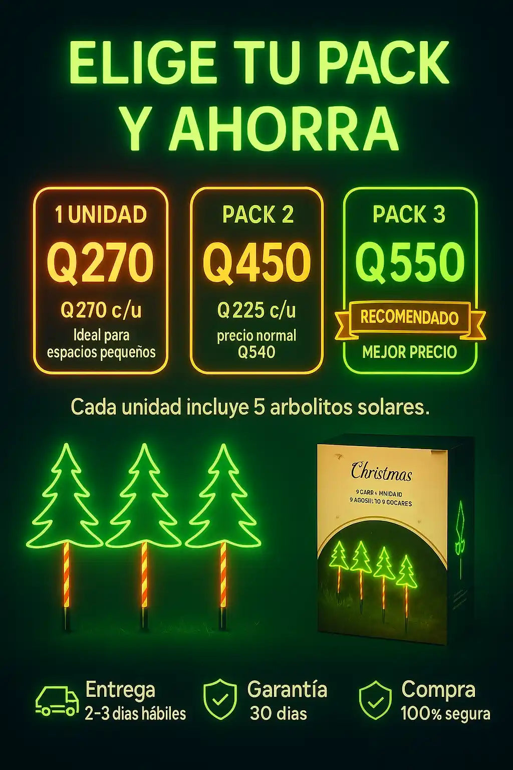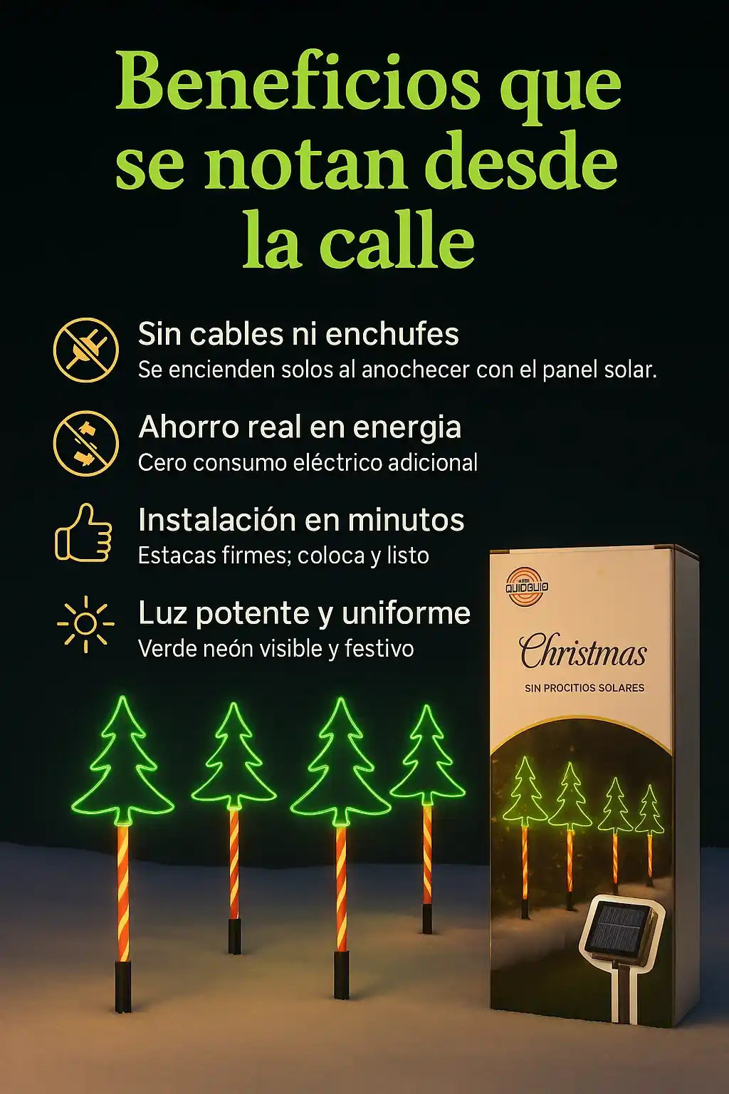 Cada unidad trae 5 arbolitos solares con sus estacas + panel solar y control ON/AUTO.